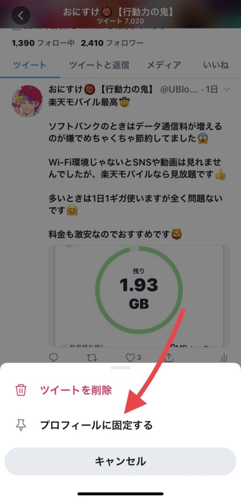 - 「プロフィールページに固定する」を選択すると自分のタイムラインの一番上に表示することができます。