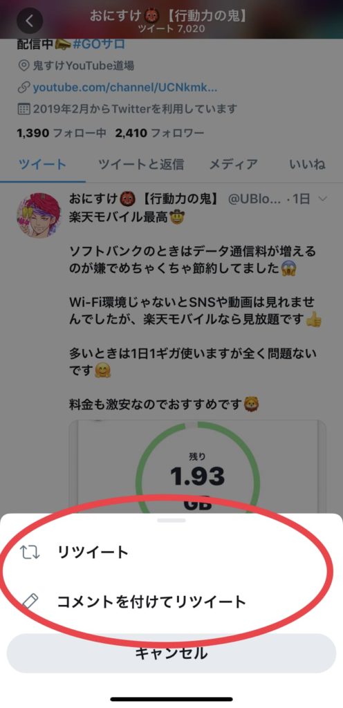 - リツイートとコメントを付けてリツイートの選択肢が出る