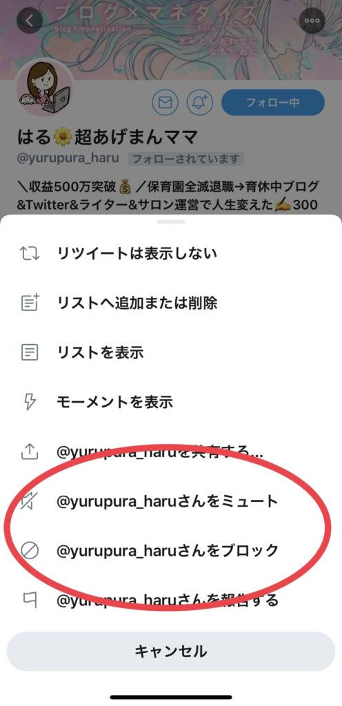 - @◯◯◯◯◯をミュートまたはブロックの選択肢をタップ
