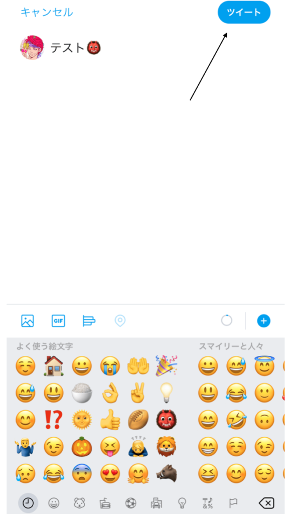 - ツイートの内容が決まったら、右上のツイートボタンをタップで完了です!