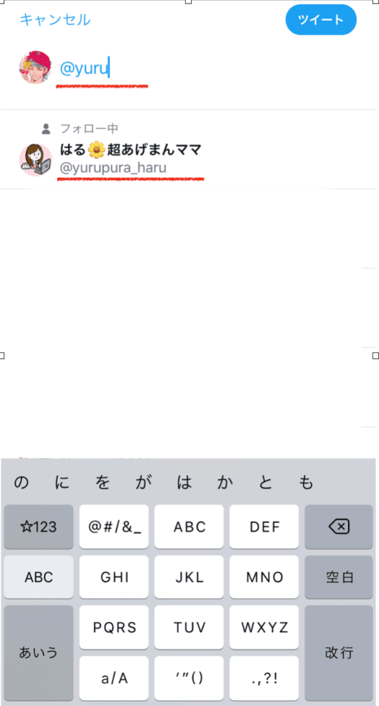 - その状態で右下の羽のマークをタップすると@◯◯◯◯のようにツイート本文に相手のIDが表示されます。